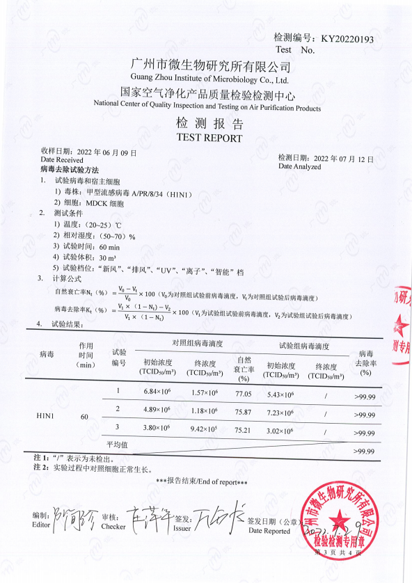 【權威檢測機構對系統(tǒng)設備的病毒測試報告,病毒去除率>99.99%】