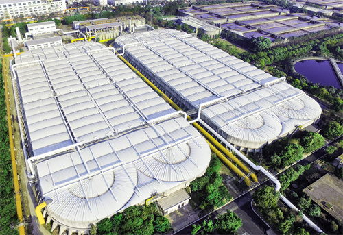 項目二:該項目日均污水處理量高達40萬噸,總處理氣量為195000m3/h,密封設計總面積約15200m2,采用多層化學洗滌凈化裝置與生物洗滌過濾除臭系統(tǒng),其膜結(jié)構密封系統(tǒng)使用了新技術,配備性能卓越的綠色環(huán)保填料,運行過程無需添加藥劑,惡臭氣體去除率高達95%以上。