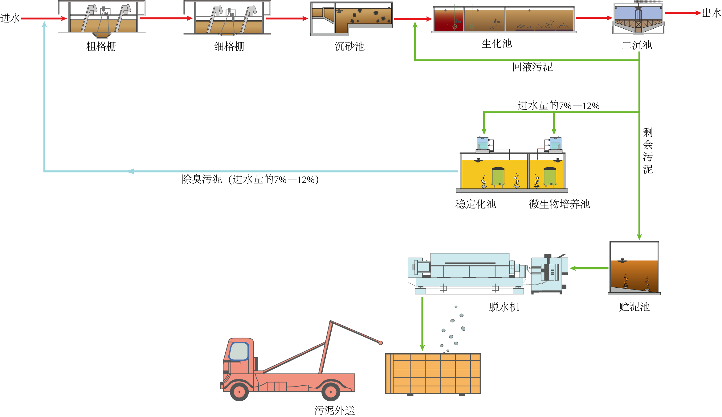 Gelor®-ZHBR根源除臭設(shè)備采用GELOR®-ZHBR生物反應(yīng)器和優(yōu)勢生物除臭菌種馴化培養(yǎng)機(jī)制一體化設(shè)計(jì)。利用土壤微生物除臭原理,在GELOR®-ZHBR生物反應(yīng)器中同步投加營養(yǎng)和壓縮空氣,通過湍動攪拌,使污泥與營養(yǎng)素、壓縮空氣形成流化狀態(tài),三者充分混合、接觸反應(yīng),從中優(yōu)選培養(yǎng)、增殖以芽孢桿菌為主的土壤微生物優(yōu)勢除臭菌群;通過污泥回流泵和管道系統(tǒng),將優(yōu)勢菌種不斷釋放到污水處理廠前端,并依次進(jìn)入各個(gè)污水構(gòu)筑物處理單元,吸附、降解污水處理過程中產(chǎn)生的硫化氫、硫醇、硫醚、氨等致臭污染物,同時(shí)加快降解污水中有機(jī)污染物、氮、磷和其他污染因素,即伴隨污水處理整個(gè)過程,同步凈化污水處理過程產(chǎn)生的臭氣,從根本上杜絕臭氣的產(chǎn)生和散逸。